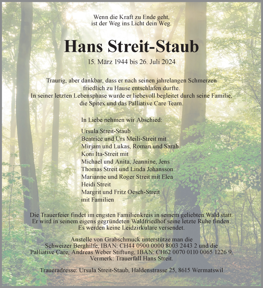 Todesfall Mitglied Hans Streit